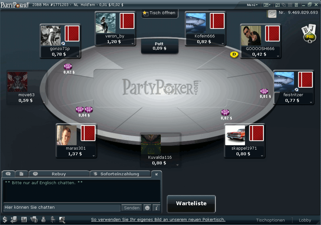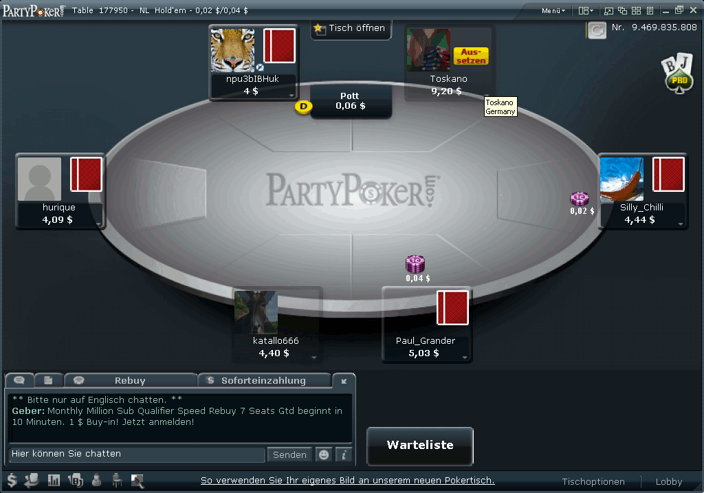 10 Spieler Party Poker Tunier Tisch, der 10 Spieler Tisch ist auch als Bargeld Tisch zu Spielen aber nur die Ersten 61 Tage nach der Anmeldung bzw. Ersteinzahlung !
